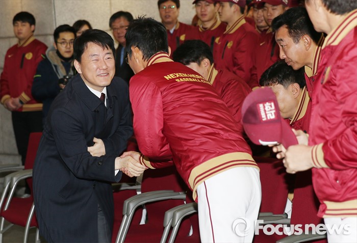 (서울=포커스뉴스) 6일 목동구장에서 열린 프로야구 2016 넥센 히어로즈 시무식에서 이장석 대표가 염경엽 감독과 악수하고 있다.