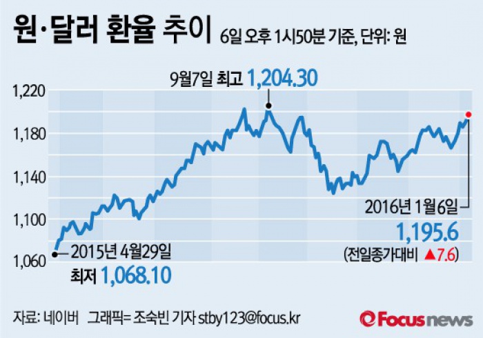 마주옥 키움증권 연구원은 "북한의 핵실험 이슈가 원화가치 변동성에 큰 영향을 줬지만 그 영향력은 제한적일 것"이라며 "환율이 1200원선을 돌파할 경우 외국인 이탈이 가속화될 수도 있다"고 전망했다.(서울=포커스뉴스) 6일 오후 1시50분 현재 서울 외환시장에서 원‧달러 환율은 전일 종가보다 7.6원 오른 1195.6원에 거래되고 있다. 2016.01.06 조숙빈 기자