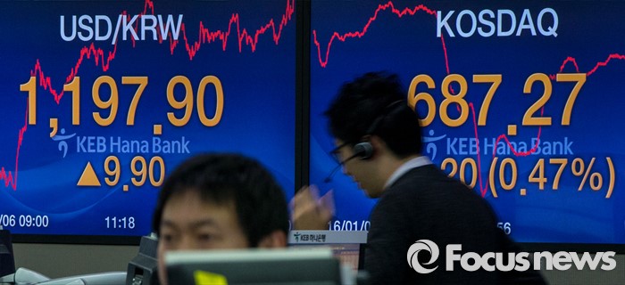 (서울=포커스뉴스) 코스피 지수가 전거래일 보다 5.10포인트(0.26%) 하락한 1,925.43에 거래를 마치며, 북한의 수소탄 실험에도 1920선을 지킨 6일 오후 서울 중구 KEB하나은행 본점 딜링룸에서 딜러들이 업무를 보고 있다. 이날 원달러 환율은 전거래일 보다 9.9원 오른 1197.9원에 마감하며, 지난해 9월 1200.9원 이후 4개월 만에 최고치를 기록 했다.