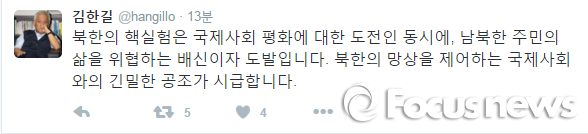이날 김 의원은 자신의 트위터에 "북한의 망상을 제어하는 국제사회와의 긴밀한 공조가 시급하다"며 이같이 말했다.