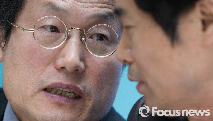 (서울=포커스뉴스) 6일 오후 서울 종로구 서울특별시교육청에서 조희연(왼쪽) 교육감과 김승환 전라북도 교육감이 정부의 누리과정 예산 미편성 시 강력 대처 발표 관련 긴급 기자회견에서 이야기를 나누고 있다.