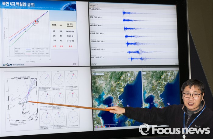 (대전=포커스뉴스) 북한이 수소탄 핵실험을 성공했다고 발표한 가운데 6일 오후 대전 유성구 한국지질자원연구원 지진연구센터에서 신진수 국토지질연구본부장이 북한 수소탄 실험에 대한 조사결과 브리핑을 하고 있다.