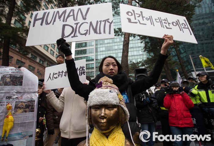 (서울=포커스뉴스) 6일 오후 서울 종로구 위안부 소녀상 앞에서 올해로 24주년을 맞은 일본군 위안부 문제 해결을 위한 1212차 수요 시위가 끝난 후 예술인 참석자들이 피켓을 들고 퍼포먼스를 하고 있다.