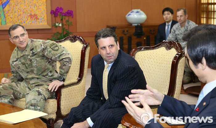 (서울=포커스뉴스) 북한이 첫 수소탄 핵실험을 실시했다고 발표한 6일 오후 서울 종로구 외교부청사에서 커티스 스캐퍼로티(왼쪽부터) 한미연합사령관과 마크 리퍼트 주한 미대사, 윤병세 외교부 장관이 대화하고 있다.