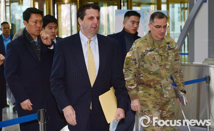 (서울=포커스뉴스) 북한이 첫 수소탄 핵실험을 실시했다고 발표한 6일 오후 서울 종로구 외교부청사에서 마크 리퍼트(왼쪽) 주한 미대사와 커티스 스캐퍼로티 한미연합사령관이 발걸음을 옮기고 있다.