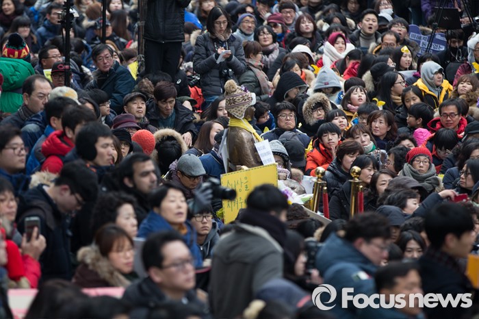 (서울=포커스뉴스) 6일 오후 서울 종로구 위안부 소녀상 앞에서 올해로 24주년을 맞은 일본군 위안부 문제 해결을 위한 1212차 수요 시위가 열리고 있다.