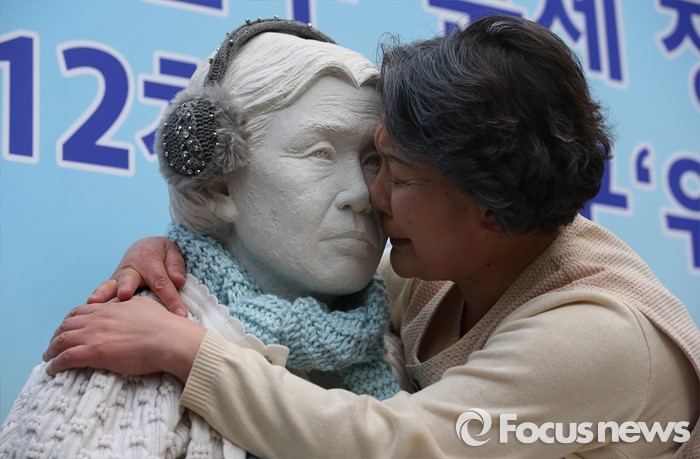 (서울=포커스뉴스) 일본군 위안부 문제 해결을 위한 정기 수요집회 24주년인 6일 오후 서울 종로구 주한일본대사관 앞에서 열린 집회에서 한 예술인이 퍼포먼스를 하고 있다.
