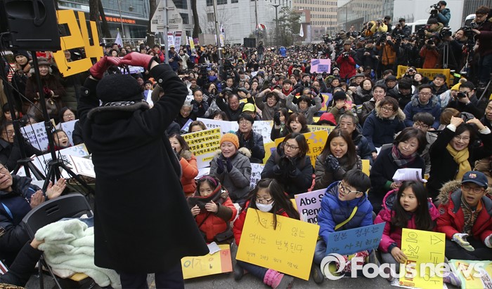 (서울=포커스뉴스) 6일 서울 종로구 옛 일본대사관 앞에서 열린 제1212차 정기수요집회에서 이용수 할머니가 참석자들에게 하트를 만들어 보이고 있다. 단일 주제로 벌이는 세계 최장기 집회로 알려진 정기수요집회는 1992년 1월 8일 시작해 금일로 24주년을 맞이했다.