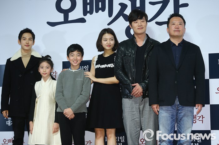 (서울=포커스뉴스) 6일 오후 서울 광진구 롯데시네마 건대입구점에서 열린 영화 '오빠생각' 언론시사회에 참석한 배우 임시완(왼쪽부터), 이레, 정준원, 고아성, 이희준과 영화감독 이한이 포토타임을 갖고 있다.