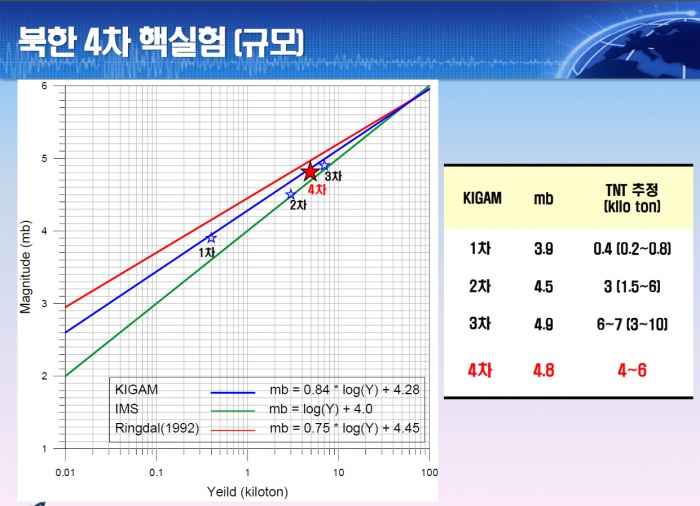 (서울=포커스뉴스) 북한이 4차 핵실험을 감행한 6일 오후 대전 유성구 한국지질자원연구원 지진연구센터에서 공개한 북한 4차 핵실험 구모를 보여주는 자료. <사진제공=한국지질자원연구원 지진연구센터>