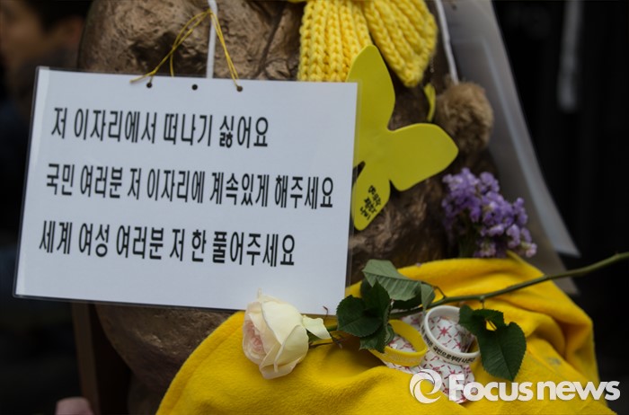 (서울=포커스뉴스) 6일 오후 서울 종로구 중학동 일본대사관 앞에서 열리는 일본군 위안부 문제 해결을 위한 수요시위가 24주년을 맞았다. 소녀상 위에 노랑 장미가 놓여 있다.