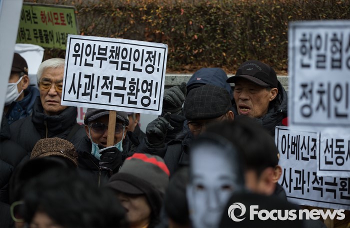 (서울=포커스뉴스) 6일 오후 서울 종로구 중학동 일본대사관 앞에서 일본군 위안부 문제 해결을 위한 24주년 수요시위가 끝난 후 소녀상 주변에 모인 보수단체 회원들이 '위안부 책임 인정! 사과! 적극환영!'이란 피켓을 들고 시위하고 있다.