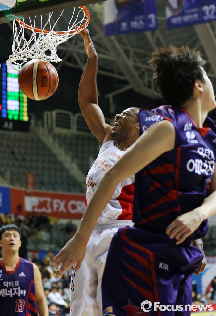 (고양=포커스뉴스) 6일 고양체육관에서 열린 2015-2016 프로농구 오리온-SK 경기에서 SK 사이먼이 오리온 허일영의 마크를 피해 원핸드 덩크슛을 림 안에 꽂아넣고 있다.