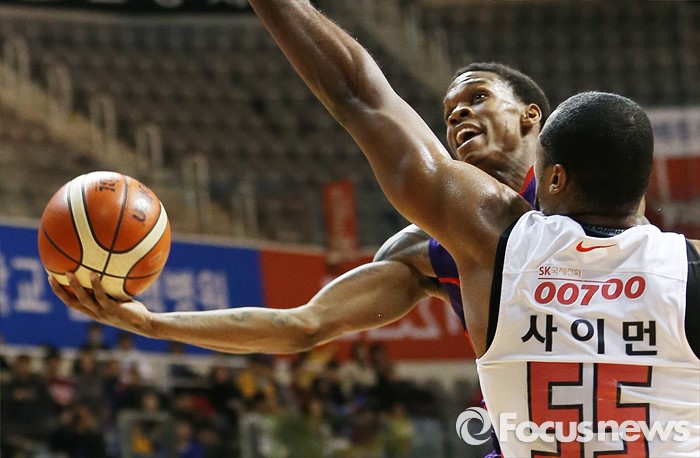 (고양=포커스뉴스) 6일 고양체육관에서 열린 2015-2016 프로농구 오리온-SK 경기에서 오리온 조 잭슨이 SK 사이먼의 블로킹을 피해 레이업슛을 시도하고 있다.
