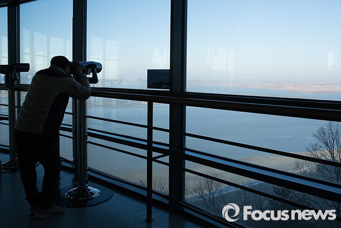 (파주=포커스뉴스) 7일 오전 경기도 파주 오두산 통일전망대에서 관광객이 망원경을 통해 황해북도 개풍군 일대를 관측하고 있다.