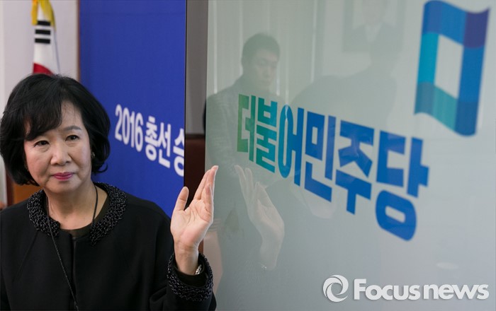 (서울=포커스뉴스) 손혜원 더불어민주당 홍보위원장이 7일 오전 서울 여의도 국회에서 당 로고 공개 기자간담회에서 취재진을 향해 포즈를 취하고 있다.