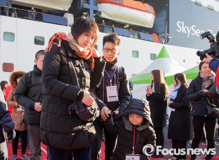 (동해=포커스뉴스) 7일 오전 강원 동해항 중앙부두에 입항한 중국 천해크루즈사의 스카이씨 골든 에라호에서 중국인 관광객들이 하선하고 있다. 이날 강원도를 찾은 관광객 1천800여 명은 정선 강원랜드 눈썰매장, 평창 용평·알펜시아스키장, 속초 중앙시장, 설악산 등을 둘러볼 예정이다.