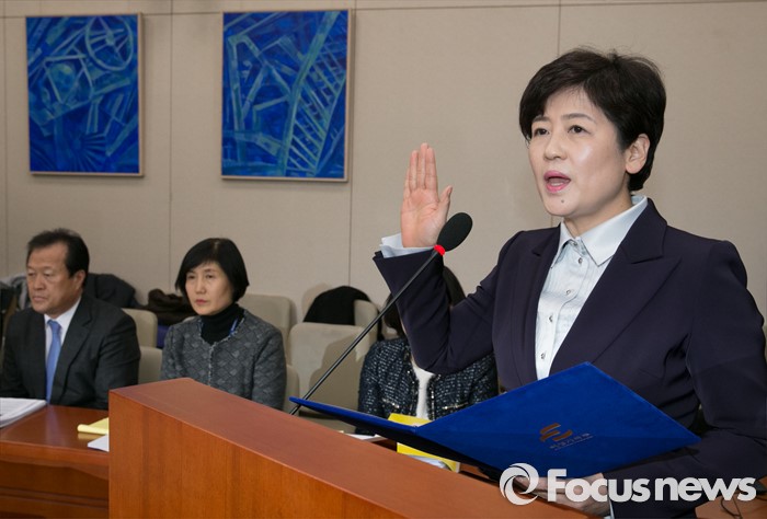 (서울=포커스뉴스) 강은희 여성가족부 장관 후보자가 7일 오전 서울 여의도 국회에서 열린 인사청문회에 참석해 선서를 하고 있다.