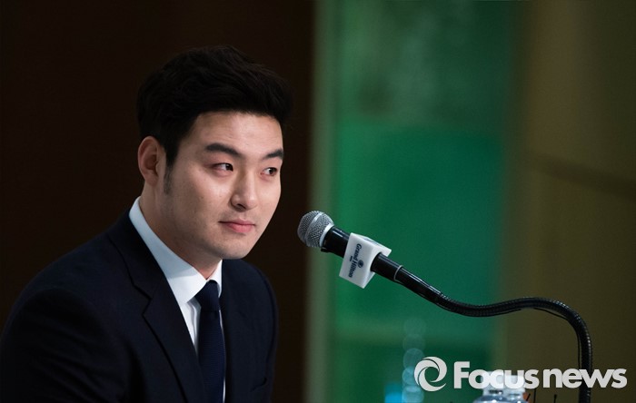 (서울=포커스뉴스) 미네소타 트윈스에 입단한 박병호가 7일 오전 서울 서대문구 그랜드힐튼호텔에서 기자회견을 열고 메이저리그 진출에 대한 소감과 포부를 밝히고 있다.
