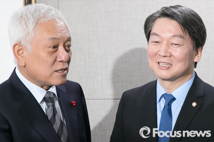 (서울=포커스뉴스) 더불어민주당을 탈당한 김한길(왼쪽), 안철수 의원이 7일 오후 서울 여의도 국회 의원회관 의원식당에서 오찬 회동을 위해 만나, 대화하고 있다.