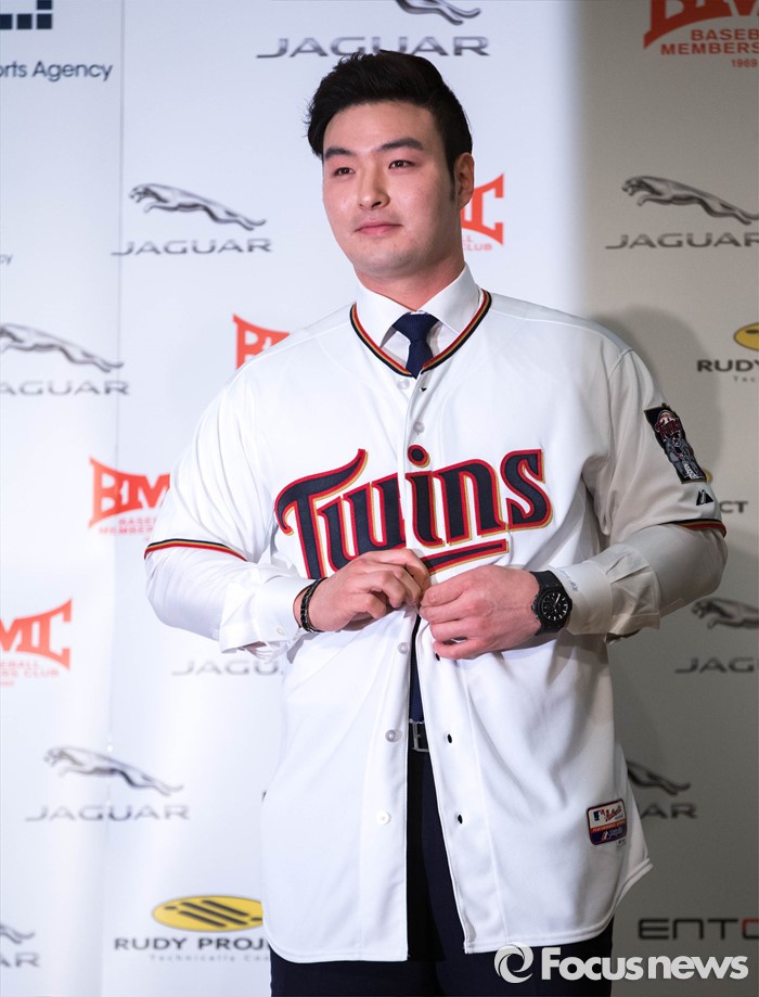 (서울=포커스뉴스) 미네소타 트윈스에 입단한 박병호가 7일 오전 서울 서대문구 그랜드힐튼호텔에서 기자회견을 열고 메이저리그 진출에 대한 소감과 포부를 밝힌 뒤 미네소타 트윈즈 유니폼을 입고 포즈를 취하고 있다.