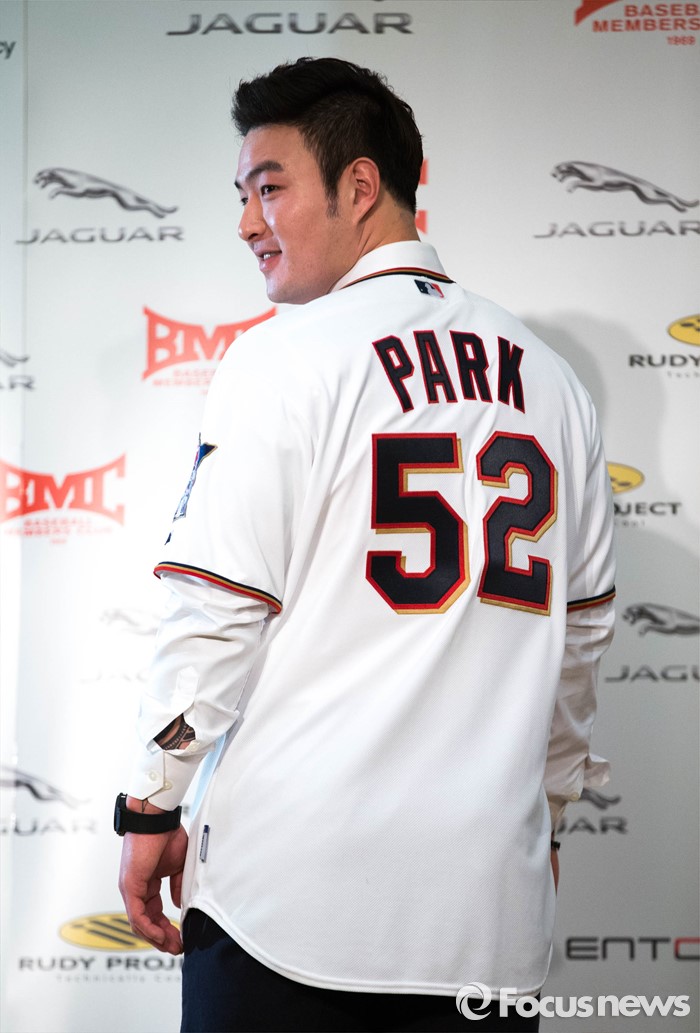(서울=포커스뉴스) 미네소타 트윈스에 입단한 박병호가 7일 오전 서울 서대문구 그랜드힐튼호텔에서 기자회견을 열고 메이저리그 진출에 대한 소감과 포부를 밝힌 뒤 미네소타 트윈즈 유니폼을 입고 포즈를 취하고 있다.