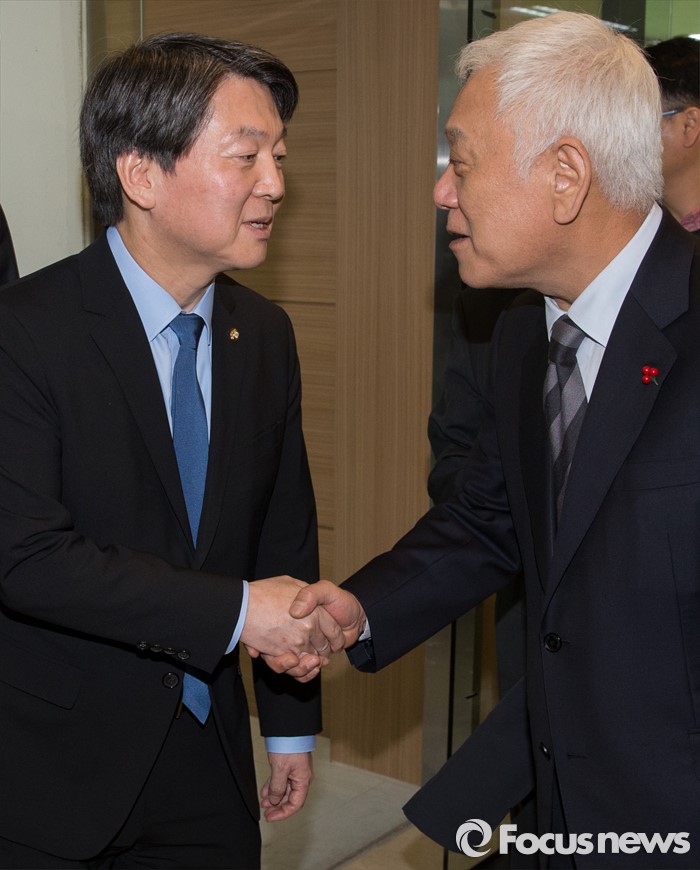 (서울=포커스뉴스) 야권 신당을 추진 중인 안철수, 김한길 무소속 의원이 7일 오후 서울 마포구 신당 당사에서 국민공감포럼 신당 참여 기자회견과 북한 핵실험 관련 성명 발표를 마친 뒤 인사를 하고 있다.