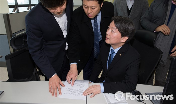 (서울=포커스뉴스) 야권 신당을 추진 중인 안철수, 무소속 의원이 7일 오후 서울 마포구 공사중인 신당 당사에서 관계자들과 대화를 나누고 있다.