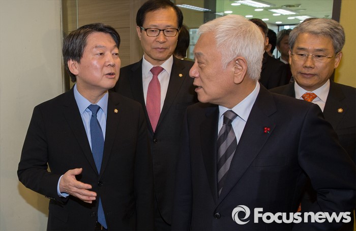 (서울=포커스뉴스) 야권 신당을 추진 중인 안철수, 김한길 무소속 의원이 7일 오후 서울 마포구 신당 당사에서 국민공감포럼 신당 참여 기자회견과 북한 핵실험 관련 성명 발표를 마친 뒤 대화를 나누고 있다.
