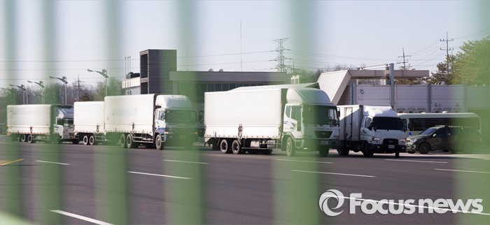 (파주=포커스뉴스) 7일 오후 개성공단 입주기업 차량들이 경기 파주시 남북출입사무소를 통해 입경하고 있다.