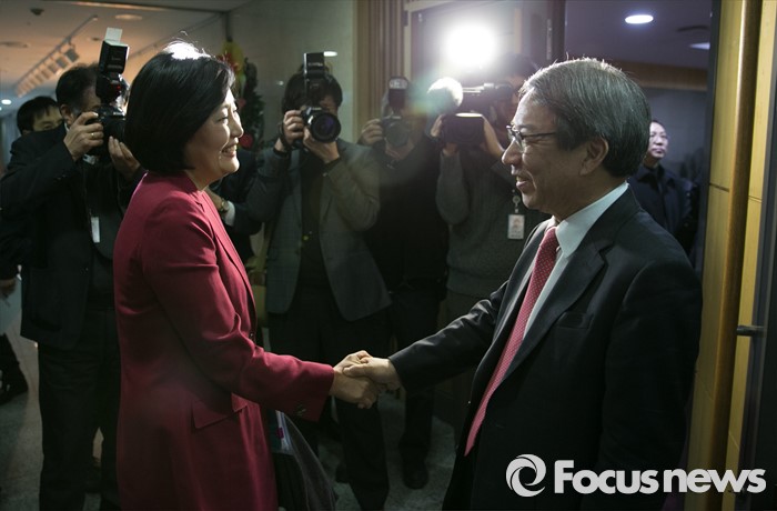 (서울=포커스뉴스) 7일 오후 서울 여의도 국회 의원회관에서 동반성장연구소 주최로 열린 '동반성장과 경제민주화, 잘 되고 있는가?' 포럼에 참석한 박영선(왼쪽) 더불어민주당 의원과 정운찬 전 총리가 인사하고 있다.