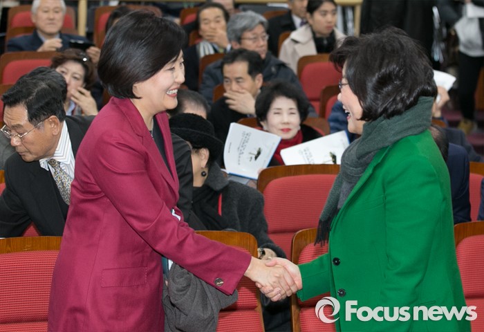 (서울=포커스뉴스) 7일 오후 서울 여의도 국회 의원회관에서 동반성장연구소 주최로 열린 '동반성장과 경제민주화, 잘 되고 있는가?' 포럼에 참석한 이혜훈(오른쪽) 전 새누리당 의원과 박영선 더불어민주당 의원이 인사하고 있다.