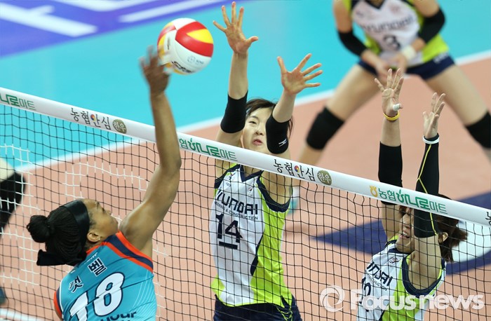 (서울=포커스뉴스) 7일 장충체육관에서 열린 '2015-2016NH농협 V-리그' 여자부 GS칼텍스-현대건설 경기에서 GS칼텍스 캣벨의 스파이크에 현대건설 양효진, 정미선이 블로킹을 대고 있다.