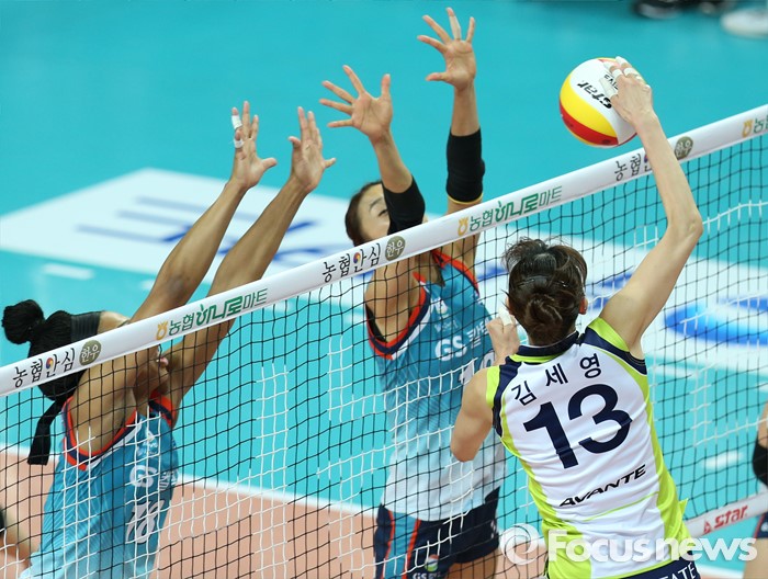 (서울=포커스뉴스) 7일 장충체육관에서 열린 '2015-2016NH농협 V-리그' 여자부 GS칼텍스-현대건설 경기에서 GS칼텍스 캣벨, 한송이가 현대건설 김세영의 공격을 블로킹하기 위해 뛰어 오르고 있다.