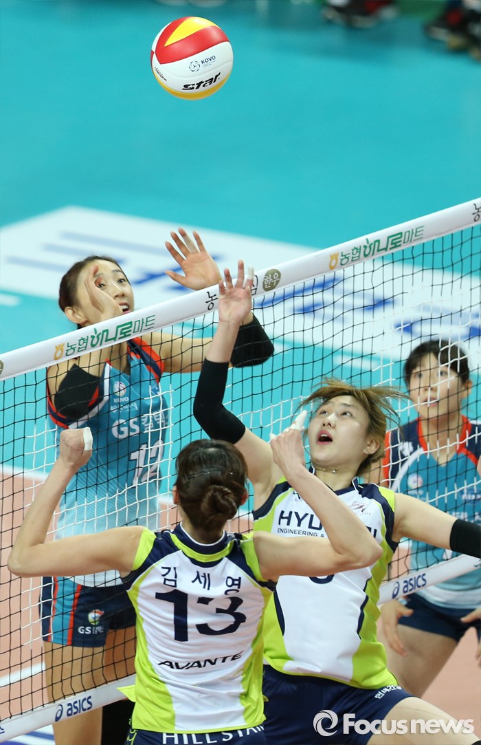 (서울=포커스뉴스) 7일 장충체육관에서 열린 '2015-2016NH농협 V-리그' 여자부 GS칼텍스-현대건설 경기에서 현대건설 세터 염혜선의 토스에 김세영이 공격 채비를 하고 있다.