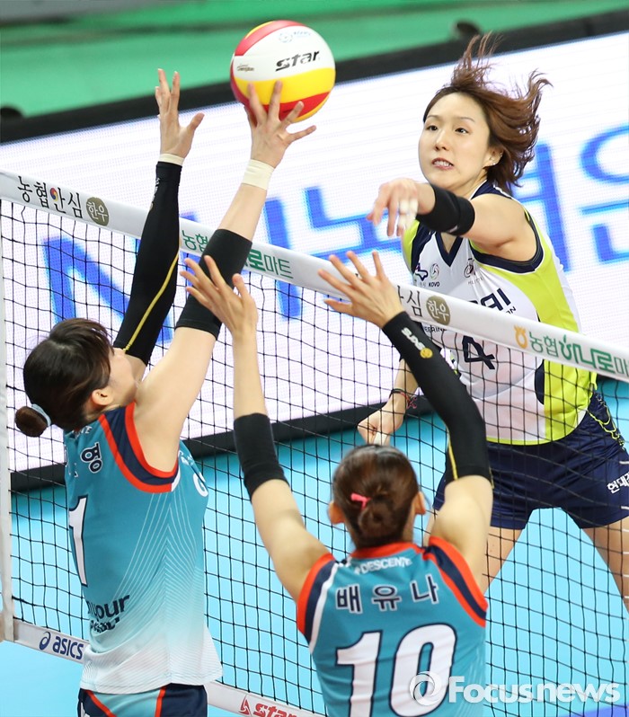 (서울=포커스뉴스) 7일 장충체육관에서 열린 '2015-2016NH농협 V-리그' 여자부 GS칼텍스-현대건설 경기에서 현대건설 황연주가 GS칼텍스 이소영, 배유나의 블로킹 위로 오픈 공격을 하고 있다.
