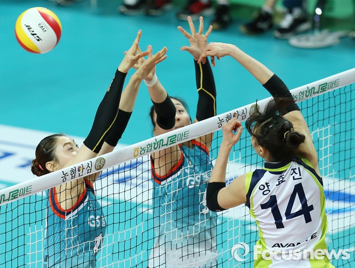 (서울=포커스뉴스) 7일 장충체육관에서 열린 '2015-2016NH농협 V-리그' 여자부 GS칼텍스-현대건설 경기에서 현대건설 양효진이 GS칼텍스 배유나, 표승주의 블로킹을 피해 연타로 볼을 넘기고 있다.