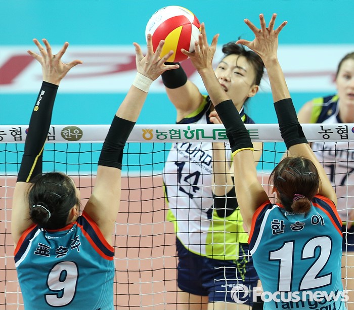 (서울=포커스뉴스) 7일 장충체육관에서 열린 '2015-2016NH농협 V-리그' 여자부 GS칼텍스-현대건설 경기에서 현대건설 양효진의 공격을 GS칼텍스 표승주, 한송이가 블로킹으로 차단하고 있다.