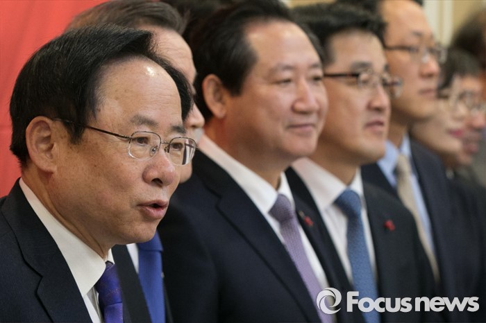 (서울=포커스뉴스) 이주영(왼쪽) 새누리당 저출산대책특위 위원장이 8일 오전 서울 여의도 국회 귀빈식당에서 열린 제3차 저출산대책특위회의에 참석해 기념사진 촬영 중 발언을 하고 있다.