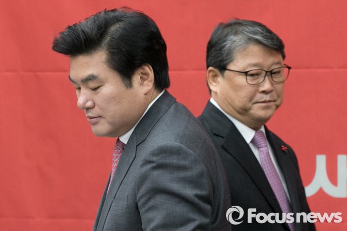 (서울=포커스뉴스) 원유철(왼쪽) 새누리당 원내대표와 조원진 원내수석부대표가 8일 오전 서울 여의도 국회에서 열린 원내대책회의에 참석하고 있다.