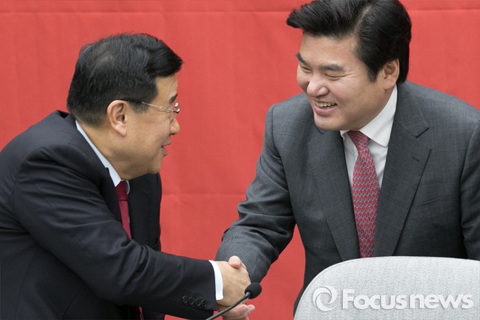 (서울=포커스뉴스) 원유철(오른쪽) 새누리당 원내대표와 김정훈 정책위의장이 8일 오전 서울 여의도 국회에서 열린 원내대책회의에 참석해 악수하고 있다.