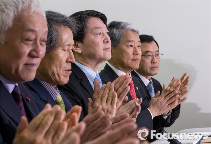 (서울=포커스뉴스) 8일 오전 서울 마포구 안철수 무소속 의원 당사 대회의실에서 열린 창당준비점검회의에서 안 의원과 참석자들이 박수치고 있다. 왼쪽부터 김한길 의원, 한상진 창당준비위원장, 안 의원, 김동철 의원, 임내현 의원.