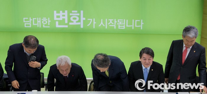 (서울=포커스뉴스) 8일 오전 서울 마포구 안철수 무소속 의원 당사 대회의실에서 열린 창당준비점검회의에서 안 의원과 참석자들이 착석하고 있다. 왼쪽부터 황주홍 의원, 김한길 의원, 한상진 창당준비위원장, 안 의원, 김동철 의원.