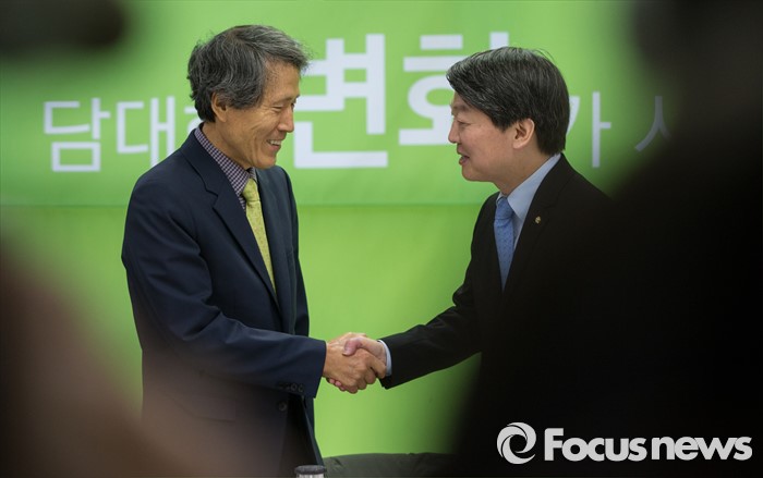 (서울=포커스뉴스) 8일 오전 서울 마포구 안철수 무소속 의원 당사 대회의실에서 열린 창당준비점검회의에 참석한 안 의원(오른쪽)이 한상진 공동창당준비위원장과 악수하고 있다.