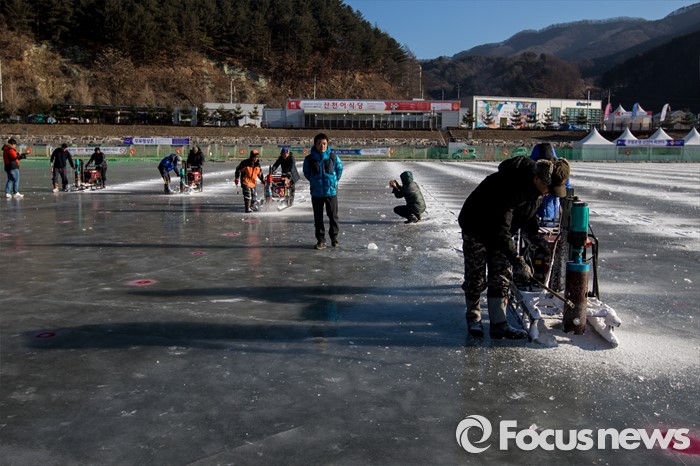(화천=포커스뉴스) 강원중북부 지역에 한파주의보가 발효된 8일 오전 강원도 화천군 산천어축제 행사장인 화천천 얼음벌판에서 축제 관계자들이 낚시 구멍을 뚫고 있다.