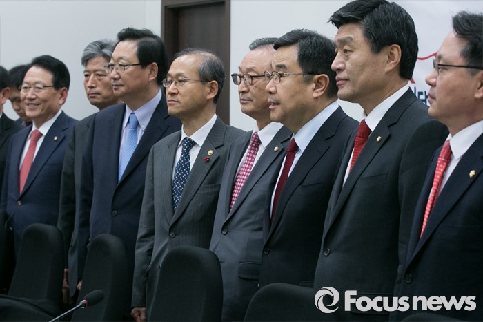 (서울=포커스뉴스) 김정훈 정책위의장을 비롯한 새누리당 의원과 정부·학계 전문가들이 8일 오전 서울 여의도 국회 새누리당 정책위원회에서 열린 북핵 관련 전문가 간담회에서, 본격적인 논의 전 기념사진을 찍고 있다. 오른쪽부터 새누리당 조명철, 심윤조 의원, 김 의장, 김성찬 의원, 임성남 외교부 제1차관.