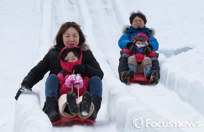 (청양=포커스뉴스) 8일 오전 충남 청양군 정산면 알프스마을에서 열린 칠갑산 얼음분수축제를 방문한 시민들이 얼음썰매를 타며 즐거운 시간을 보내고 있다.