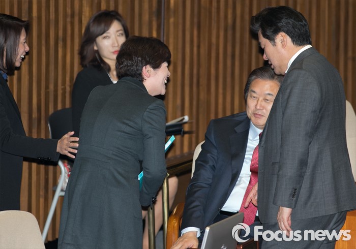 (서울=포커스뉴스) 8일 오후 서울 여의도 국회에서 열린 338회 국회(임시회) 3차 본회의에 참석한 김무성 새누리당 대표, 원유철 원내대표, 강은희 여성가족부 장관 후보자가 대화하고 있다.