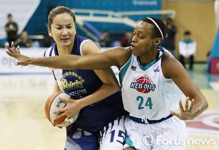 (부천=포커스뉴스) 8일 부천체육관에서 열린 2015-2016 여자프로농구 KEB하나은행-신한은행 경기에서 KEB하나은행 샤데 휴스턴이 신한은행 신정자의 돌파를 저지하고 있다.