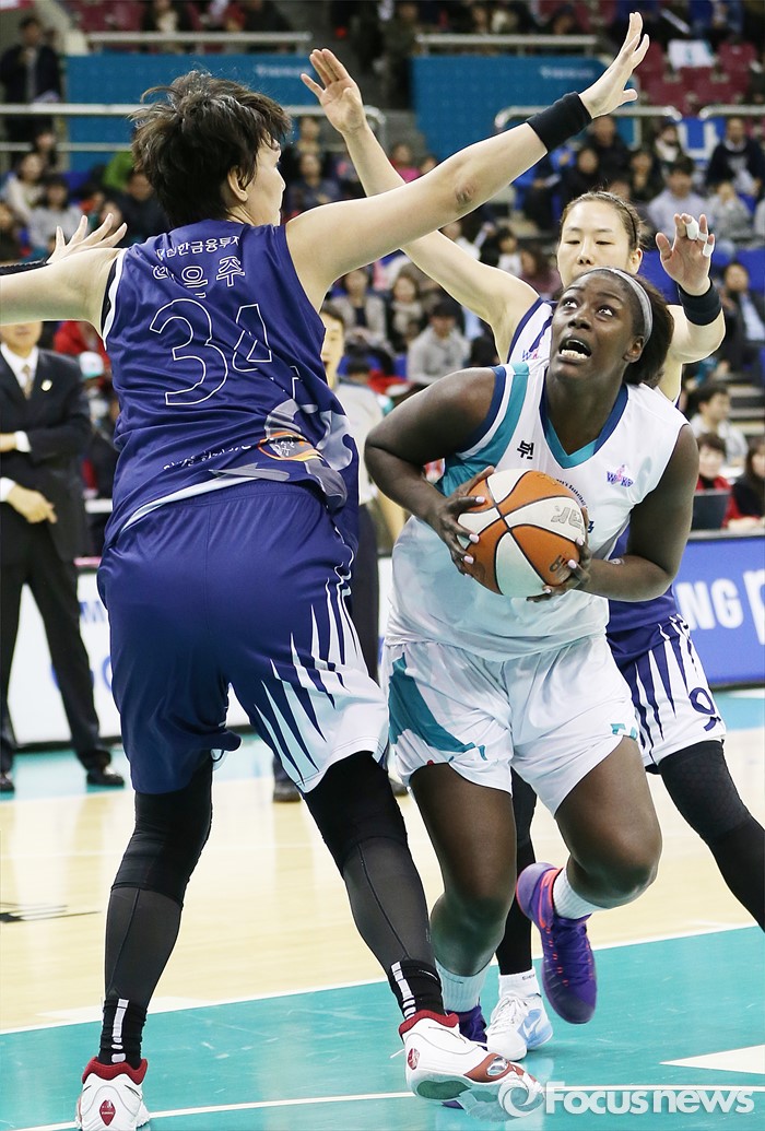 (부천=포커스뉴스) 8일 부천체육관에서 열린 2015-2016 여자프로농구 KEB하나은행-신한은행 경기에서 KEB하나은행 첼시 리가 신한은행 하은주와 곽주영의 수비를 뚫고 슈팅을 노리고 있다.